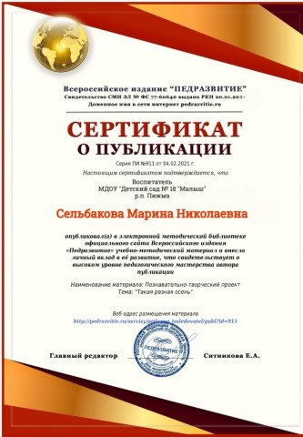 Представленные сертификаты подтверждают участие в издании статей, учебно-методических пособий и других публикаций, созданных в ходе научно-методической деятельности. Эти труды служат основой для повышения качества образовательного процесса и профессионального роста.